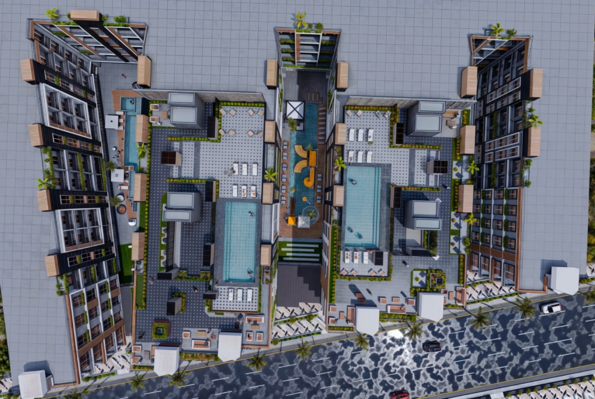Swimming Pools: 5 total (3 ground-floor, 2 rooftop)
