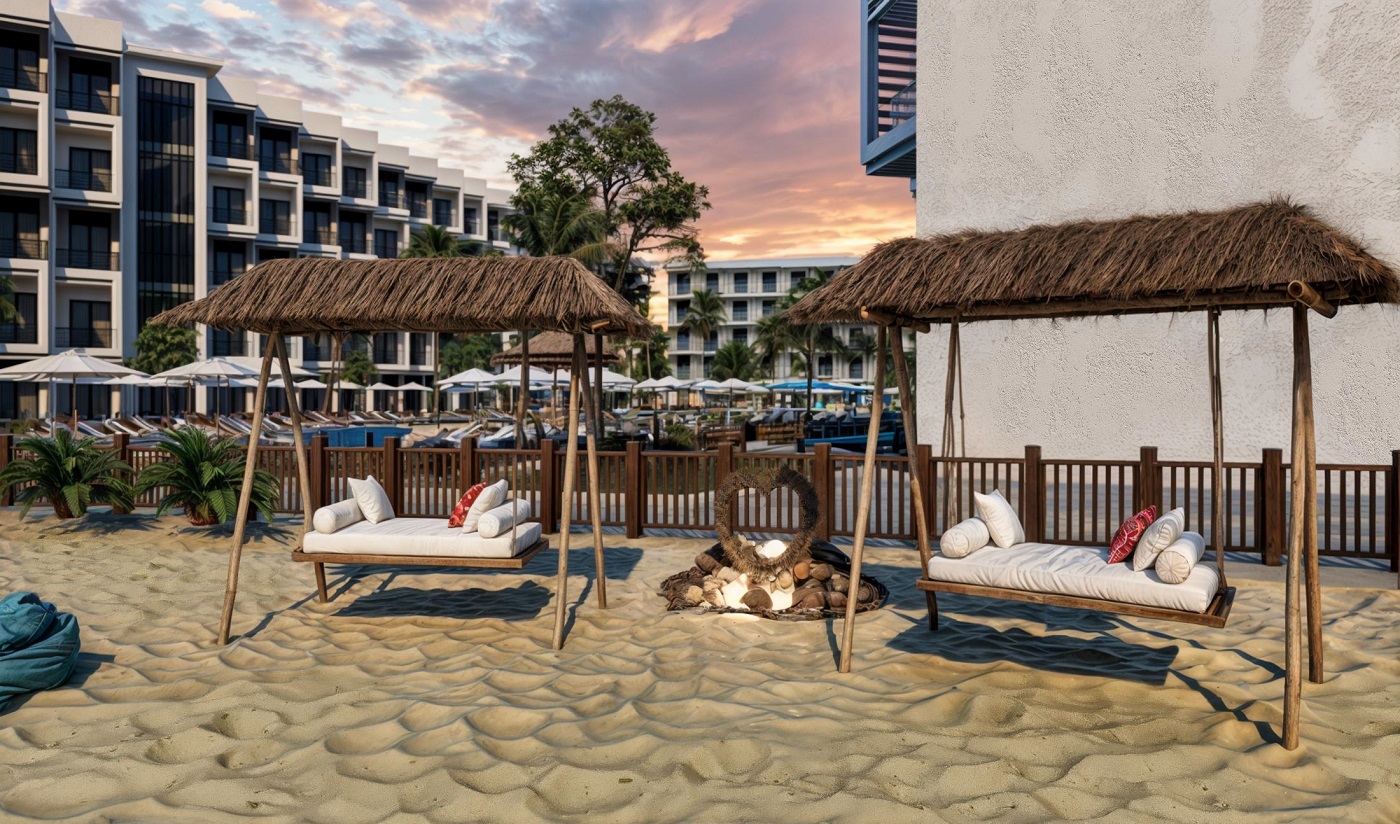 Swimming pools, landscaped gardens, and private beach access